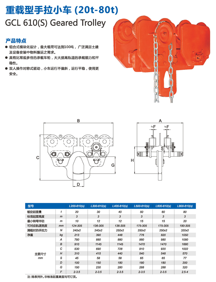 常規(guī)型手拉小車 GCL/GCT810系列小車選用了全新的高強度低合金結(jié)構(gòu)鋼,確保4倍安全載荷,輕巧、安全、安裝方便、是目前最為輕巧小車之一。 1.采用優(yōu)質(zhì)鋼材,結(jié)構(gòu)緊湊,外型美觀。 2.國際標(biāo)準(zhǔn)生產(chǎn),安全性能可靠。 3.可多種選擇,“H”型鋼、“I”型鋼均可適用。